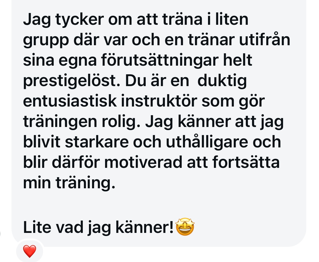Du tränar i en liten grupp och utifrån din nivå och dina villkor. Jag finns där och ger instruktioner och feedback på din träning. Träning sker på Hälsohuset i Lidköping.