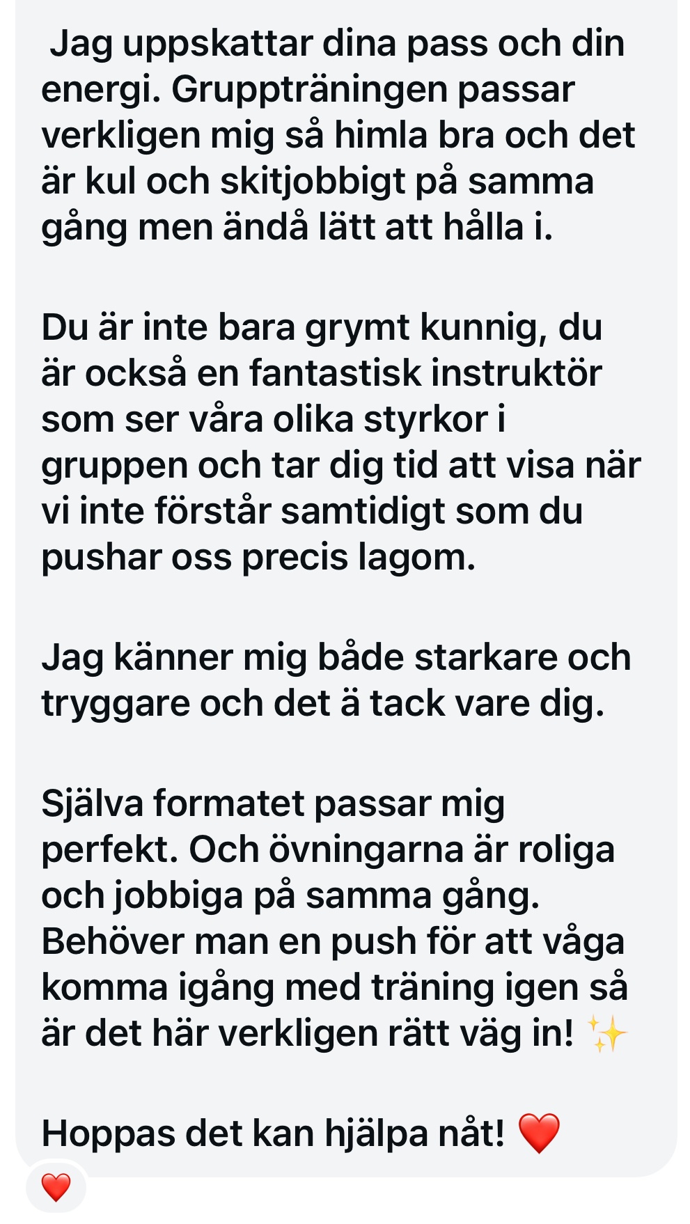 Mitt mål är att du ska känna dig trygg, stark och fri i din kropp – oavsett om du vill börja från noll, hitta tillbaka efter en paus eller ta nästa steg i din träning.